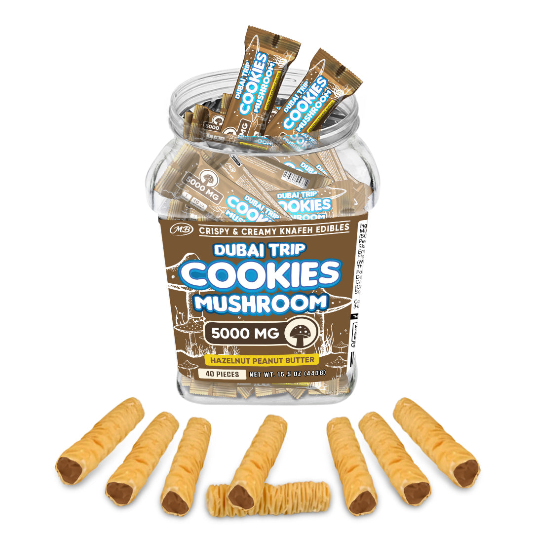 DUBAI COOKIES TRIP MUSHROOM 5000mg each with Hazelnut Chocolate Peanut Butter Cream Crispy Blunts Cream Crispy Phyllo Dough