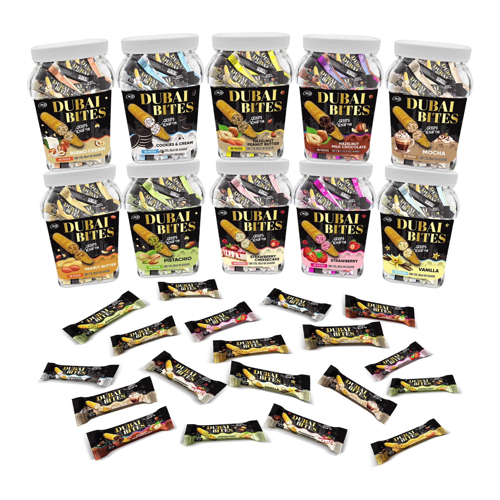 Satisfy your sweet tooth with NON INFUSED DUBAI BITES MINIS, filled with strawberry cream and crispy kataifi khunafa. Indulge in the rich flavors and unique textures of this Middle Eastern-inspired treat. Perfect for a quick, delicious snack or as a dessert at your next gathering.