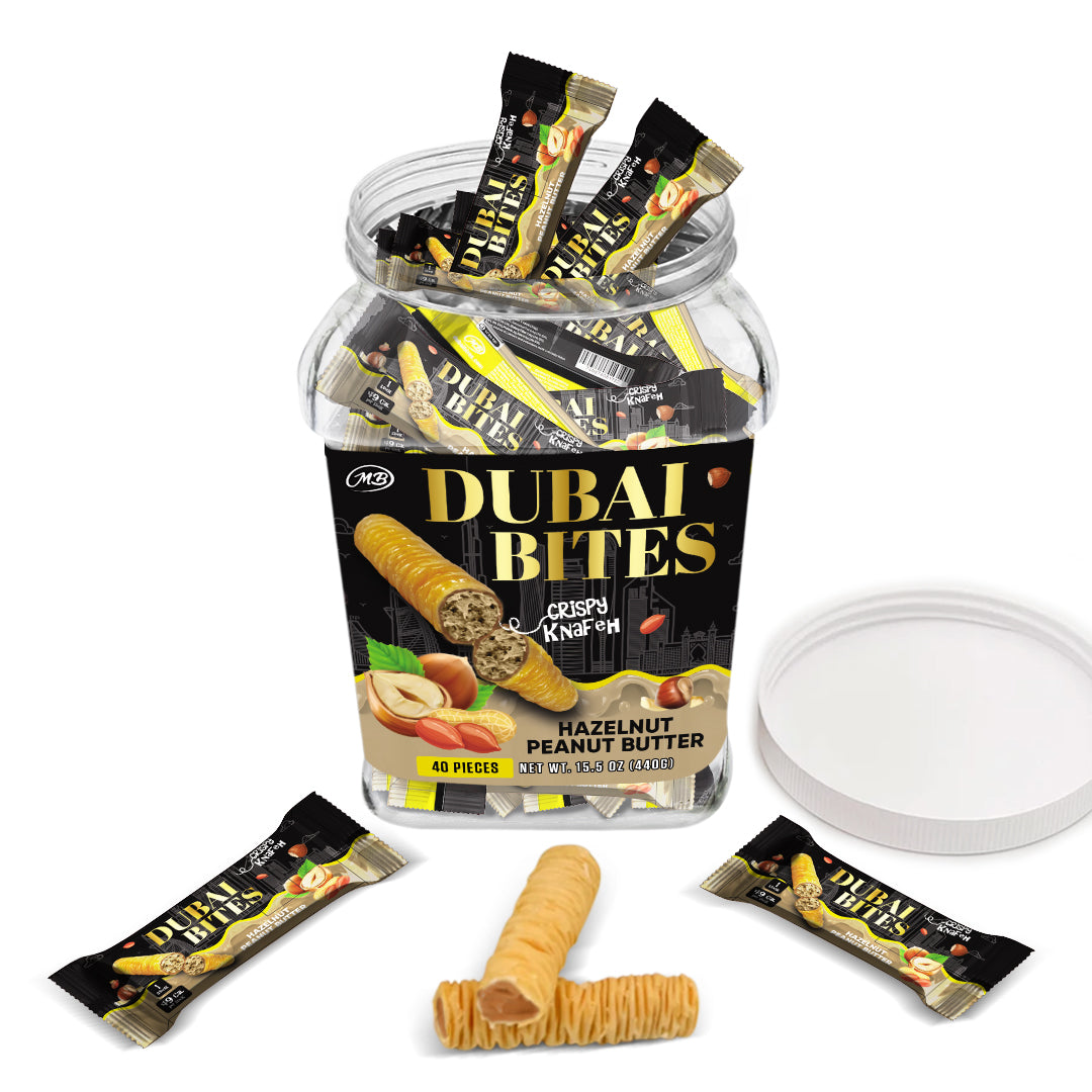 Satisfy your sweet tooth with NON INFUSED DUBAI BITES MINIS, filled with hazelnut chocolate peanut butter cream and crispy kataifi khunafa. Indulge in the rich flavors and unique textures of this Middle Eastern-inspired treat. Perfect for a quick, delicious snack or as a dessert at your next gathering.